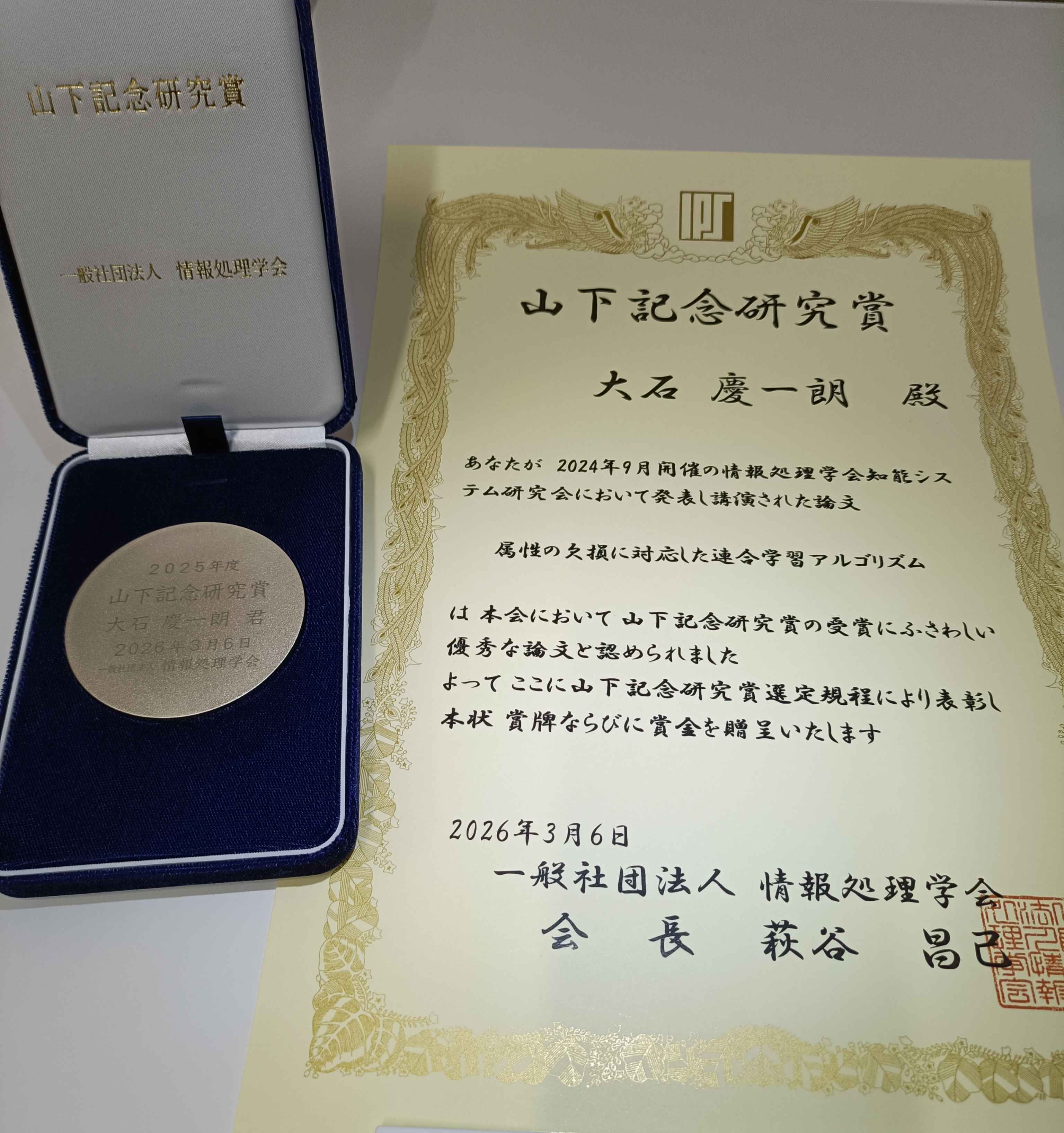 大石助教が2025年度山下記念研究賞を受賞しました 2026年4月1日 Last updated : 2026年4月1日 nakagawa_admin 大石助教が3/6~3/8に開催された情報処理学会 第88回全国大会にて受賞式に出席し,2025年度(令和7年度)山下記念研究賞を受賞しました. 受賞情報: https://www.ipsj.or.jp/award/yamashita2025.html
